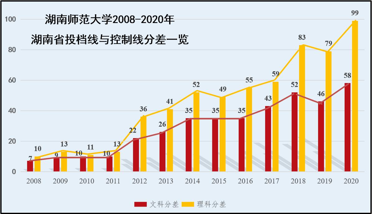 安博线上平台2008-2020年湖南省投档线与控制线分差一览