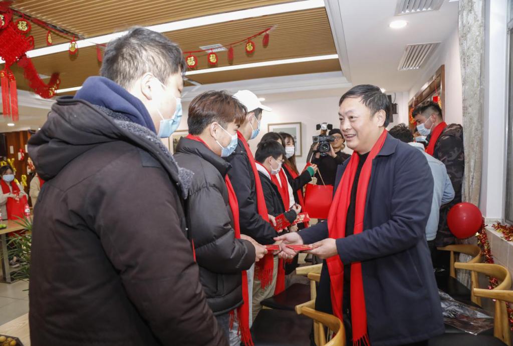 王辉代表学校向寒假留校的学生致以节日的问候和新春祝福,他说:今天是农历“小年”,是阖家团圆的日子,师生本是一家人,学校党委行政高度重视留校学生的学习生活,所有因疫情以及其他原因没能回家的同学,在学校也必能感受到家的温暖。他希望,同学们寒假期间搞好学习、保重身体,也请同学向家人代为转达学校的新春祝福。最后,他为在座的学生发放了学校新春慰问红包和防疫大礼包。