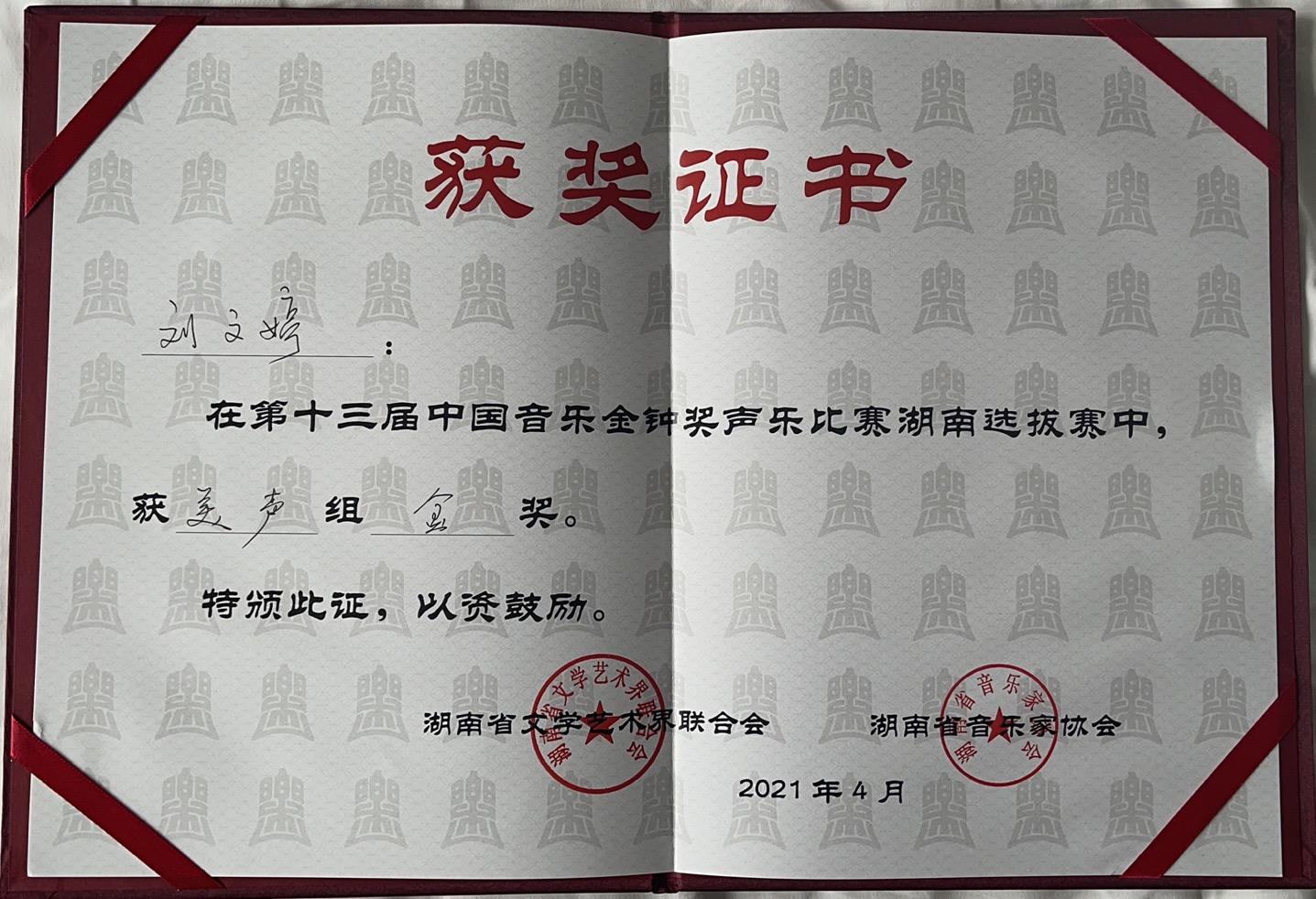 据悉,中国音乐金钟奖是由中宣部批准设立、由中国文联和中国音协共同主办的中国音乐界综合性专业大奖,是与戏剧梅花奖、电视金鹰奖、电影金鸡奖并列的国家级艺术大奖,每两年举办一届。本届中国音乐金钟奖声乐比赛湖南省选拔赛于4月24日至26日进行,我校师生经过层层选拔和激烈角逐,共同为学校争得荣誉。