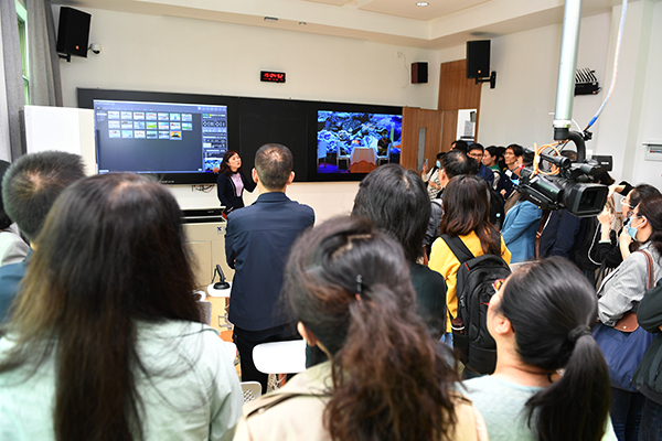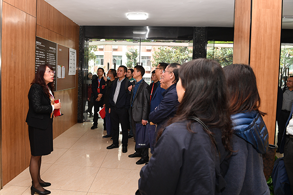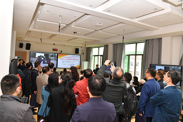 教育部英语教学指导分委员会秘书长、我校外国语学院院长曾艳钰,院党委书记唐建文等带领与会嘉宾一同参观了学院教授工作室、智慧教室、虚拟仿真实验室等,并介绍建设情况。