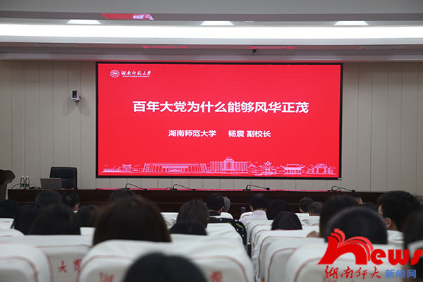 杨震以《百年大党为什么能够风华正茂》为题,从我们党为什么能得到人民的衷心拥护,为什么能走在时代前列,为什么能经得起各种考验,为什么能永葆朝气四个方面展开,深刻阐释了中国共产党的人民性、时代性、斗争性和青年性。他带领大家重温了中国共产党团结带领全国人民实现了中华民族从站起来到富起来,再到强起来的光辉历程,让大家对党的历史有了系统的了解,对党的初心使命有了更深刻的感悟。在讲授过程中,他着重将百年党史、湖南巨变和师大变化有机融合了起来,并结合个人国外访学所见所闻、学校对口扶贫及综合改革等大量实际案例,深入浅出,娓娓道来,引发了大家强烈的思想共鸣。