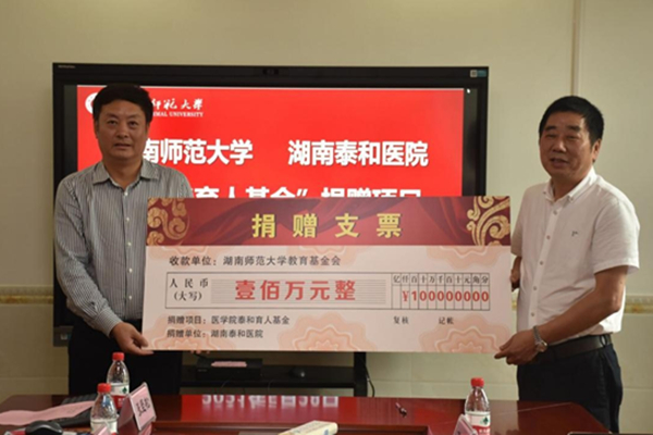 据悉,湖南泰和医院在我校设立“泰和育人基金”共计100万元,为期五年,每年捐赠20万元,主要用于奖励当年入校的高考成绩排名靠前的医学院各专业优秀新生,奖励金额为10000元/人。此次基金捐赠深化了校企合作关系,为综合性医学人才的培养提供支持,为孵化更多有价值、有潜力的好项目培养更多高素质创新创业人才贡献医学力量。