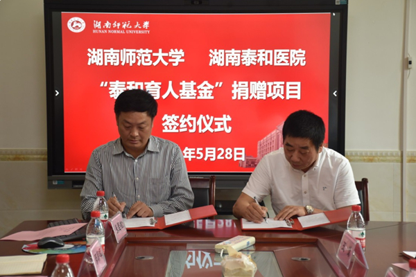 (通讯员 尹美玲 何旷智)5月28日下午,湖南泰和医院与我校在医学院办公楼四楼举行“泰和育人基金”捐赠项目签约仪式。湖南泰和医院党委书记兼董事长肖迪武、我校副校长王辉出席仪式。医学院党委书记鄢朝晖主持仪式。