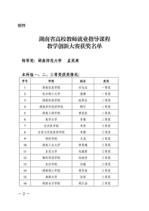 (供稿 双创办)近日,湖南省教育厅公布了2021年湖南省高校教师就业指导课程教学创新大赛获奖的结果,我校参赛代表旅游学院副教授孟奕爽在参赛的55名教师中表现卓越,荣获特等奖,并将作为我省唯一代表参加国赛。