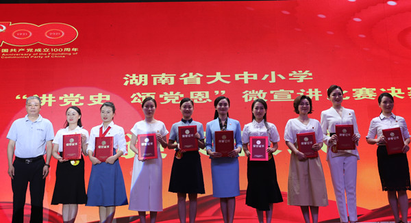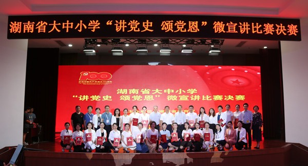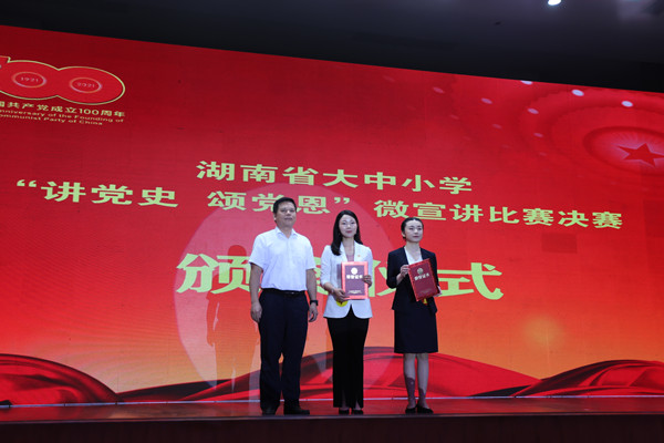 (记者 邓圣曦 朱子佑 卢星宇)6月19日,湖南省大中小学“讲党史 颂党恩”微宣讲比赛决赛在我校国际学术报告厅举行,省教育厅党组成员、副厅长王玉清,我校党委副书记周俊武出席活动。我校公共管理学院刘艳老师在本次比赛中荣获高校教师组一等奖。