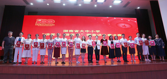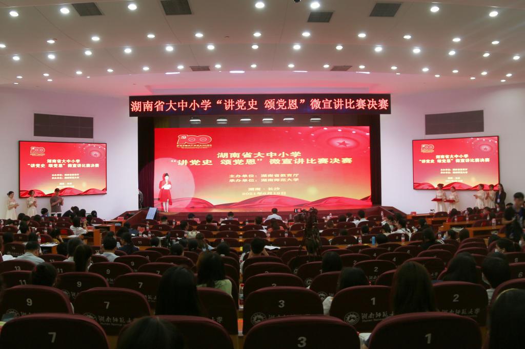 本次大赛由湖南省教育厅主办,我校承办,湖南教育电视台协办。通过各高校和各市州教育(体)局组织的初赛,省教育厅组织的复赛,共有高校组20位选手、中小学组10位选手进入决赛。比赛现场,选手们紧紧围绕党的百年光辉历史,讲道理、讲史实、讲故事,歌颂了中国共产党坚守的初心使命、创造的不朽业绩、孕育的伟大精神,富有感染力的宣讲感动了现场的评委及观众,赢得了阵阵掌声。