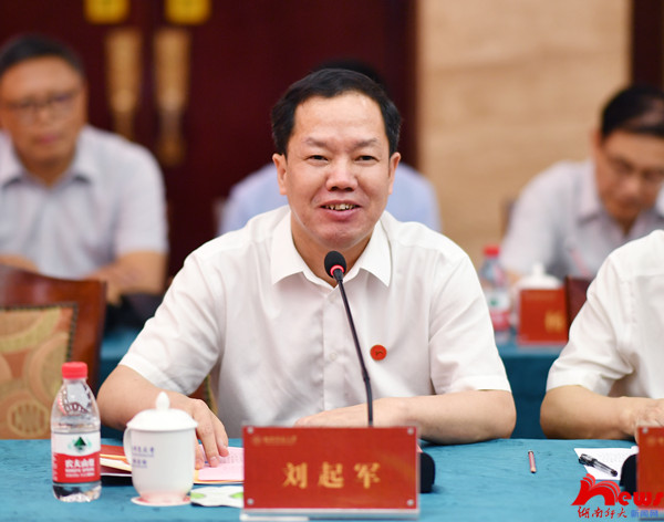 校长刘起军对郑建新一行表示热烈欢迎,对市委市政府以及各位领导长期以来对学校的关心支持表示衷心感谢。他简要介绍了我校的基本情况以及长沙市对学校的支持、学校助力长沙市发展的情况。他表示,学校将与长沙市进一步深化校地合作,争取建立全面战略合作伙伴关系,让学校建设发展与长沙的繁荣兴盛形成更为良性的互动。他恳请市委市政府对我校场馆建设和直属型附属医院建设等事项予以支持,学校定将抢抓机遇、主动作为,为助推长沙实现高质量发展和打造“最美大学科技城”贡献力量和智慧。