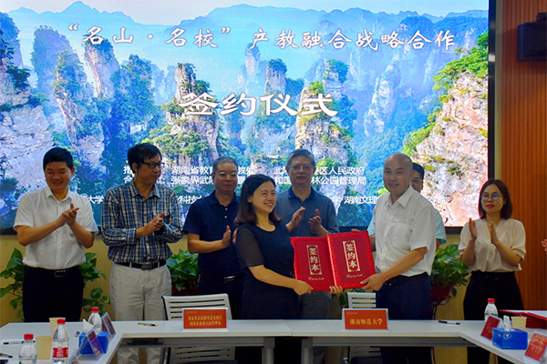 (供稿 旅游学院)7月15日上午,“名山·名校”产教融合战略合作签约仪式在我校图书馆信息中心举行。省教育厅高教处处长曾力勤,张家界市武陵源区委副书记、张管局党委副书记、常务副局长谢贵湘,我校党委副书记周俊武出席签约仪式。仪式由武陵源区委常委、组织部部长谢模强主持。