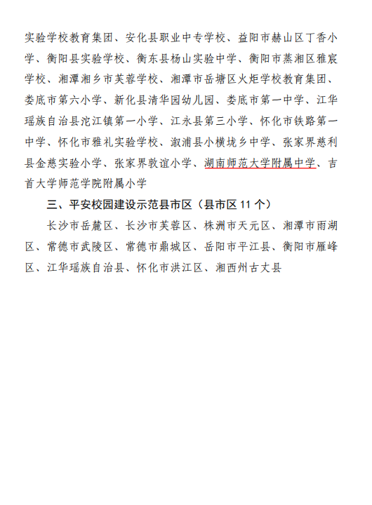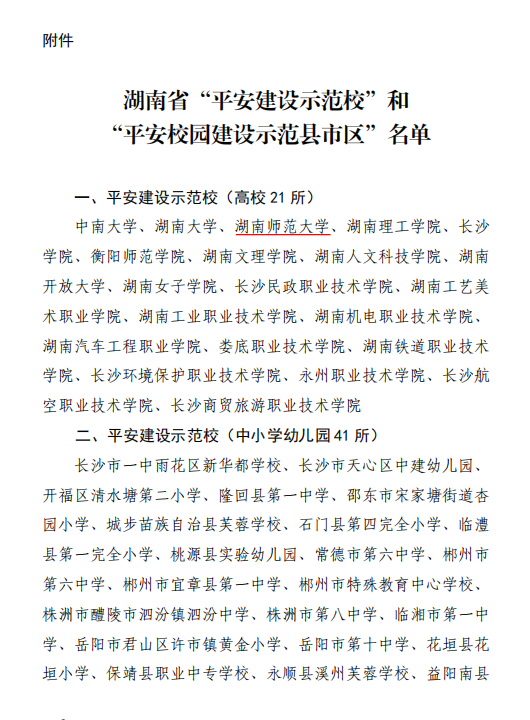 (供稿 党委办公室)近日,省委教育工委、省教育厅发布了《安博线上平台2021-2022年度湖南省平安校园示范项目评审结果的通报》,我校获评湖南省“平安建设示范校”荣誉称号。