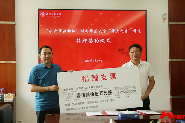 (记者 廖依扬 娄慧煜)9月27日下午,长沙市妇幼保健院与我校“师大之星”评选捐赠签约仪式在校办公楼二会议室举行,仪式由学生工作部部长向发意主持,长沙市妇幼保健院院长王东波、我校副校长王辉出席捐赠签约仪式。