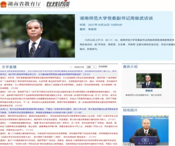 (记者 杨贤美)10月26日,我校党委副书记周俊武做客湖南教育政务网在线访谈,就“学党史 悟思想 办实事 开新局”主题与网友进行了在线交流。