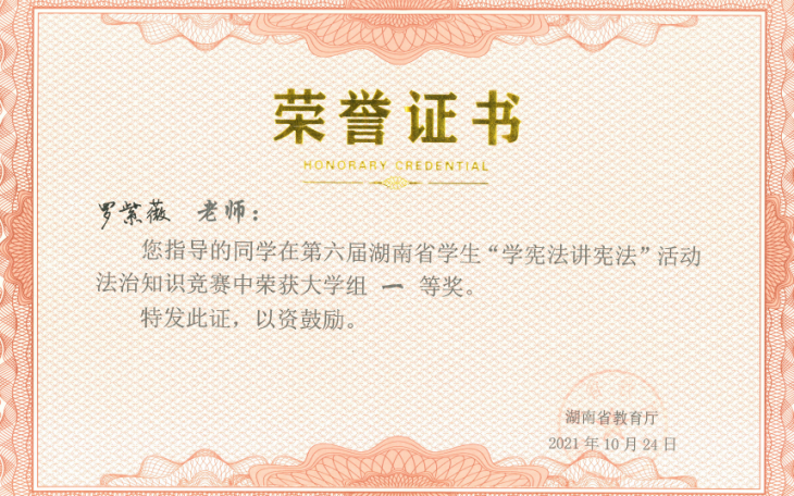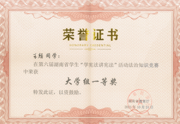 (记者 李翠霞)10月24日,由湖南省教育厅主办、湖南省法学研究基地和湘潭大学法学院联合承办的第六届全国学生“学宪法讲宪法”活动湖南赛区总决赛在湘潭大学举行。此次现场决赛分为高校组、高中组、初中组以及小学组进行,设演讲、法治知识竞赛两类赛事。我校法学院学生黄海杨荣获湖南赛区演讲比赛大学组唯一特等奖,并将代表湖南省大学生参加由教育部举办的全国总决赛。法学院学生王超荣获湖南赛区法治知识竞赛大学组一等奖。