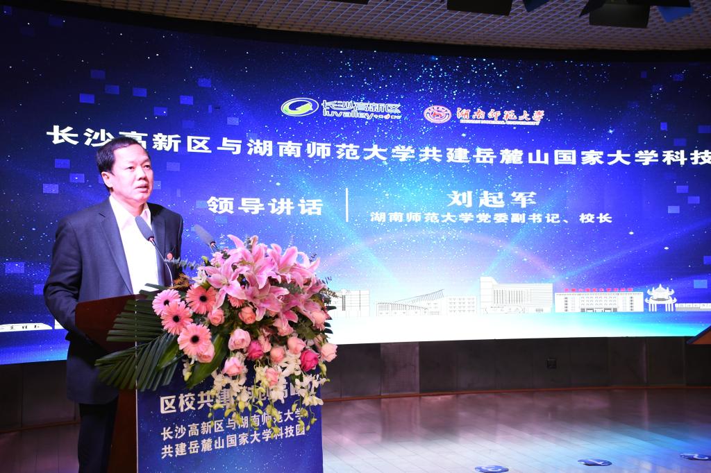 刘起军感谢长沙高新区长期以来对我校的关心与支持,并简要介绍了学校的建设情况。他表示,此次签约共建岳麓山国家大学科技园是深化校地合作、构建互利共赢新生态的有力举措,也是主动担当、落实“三高四新”战略的生动实践。此次签约后,我校15家师生科技成果转化企业将入驻岳麓山国家大学科技园,这将开启双方合作新篇章。他要求我校入驻园区的师生和师生企业,要扎扎实实开展科研,产出更多高质量、高水平的科研成果;不断推进科技成果转化,主动对接国家和湖南省发展战略,积极融入地方经济社会发展,产出实实在在的效益,助推园区发展;依法依规经营,在充分享受园区优惠政策、优良平台的基础上,为园区建设发展作出应有的贡献。他希望双方以此次合作签约为契机,进一步提升合作层次,拓宽合作领域,为湖南经济社会发展作出更大的贡献。