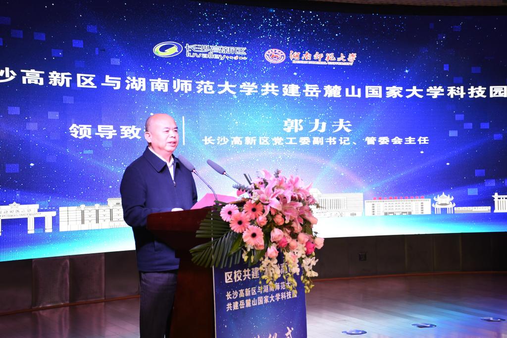 郭力夫感谢我校与长沙高新区合作共建岳麓山国家大学科技园。此次区校共建是贯彻党的十九届六中全会精神,落实“三高四新”发展战略,加快构建“产学研用”一体联动,加速高校科创成果产业化的重大举措。长沙高新区作为长沙科技创新的领头雁,以科技创新为使命,着力打造科技创新高地。高新区建设有完善的科技经营体系和科技企业全方位服务体系,成立了200亿元的产业基金,对科技企业给予从种子阶段到上市阶段全方位支持。通过完善的体系和政策支撑,已经培育了50家上市公司。他希望以此次签约为契机,吸引更多的我校师生科技成果转化企业来高新区创业发展,高新区将给予最优良的服务、最优质的保障和最优越的环境。他希望区校双方在科技创新、成果转化、人才培养、企业孵化等领域加强合作,共同擦亮岳麓山国家大学科技园的金字招牌。