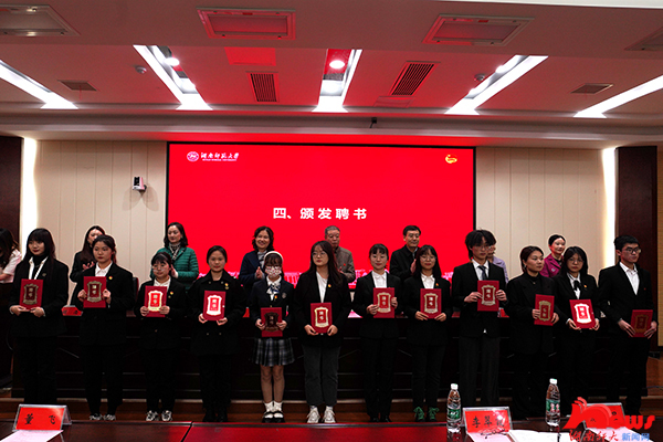 获奖学生代表张子瑜,受聘学生代表高涵分别发言。她们感谢学校对学生记者的培养,表示要努力肩负起新闻工作者的重任,为写好师大故事、传播师大声音做出贡献。