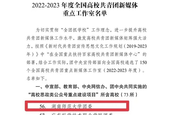 (通讯员 赵航航)近日,团中央宣传部以线上线下相结合的方式召开2021年全国高校共青团新媒体工作培训会。在此次培训会上公布的重点支持名单中,我校团委入选2022-2023年度全国高校共青团新媒体重点工作室。