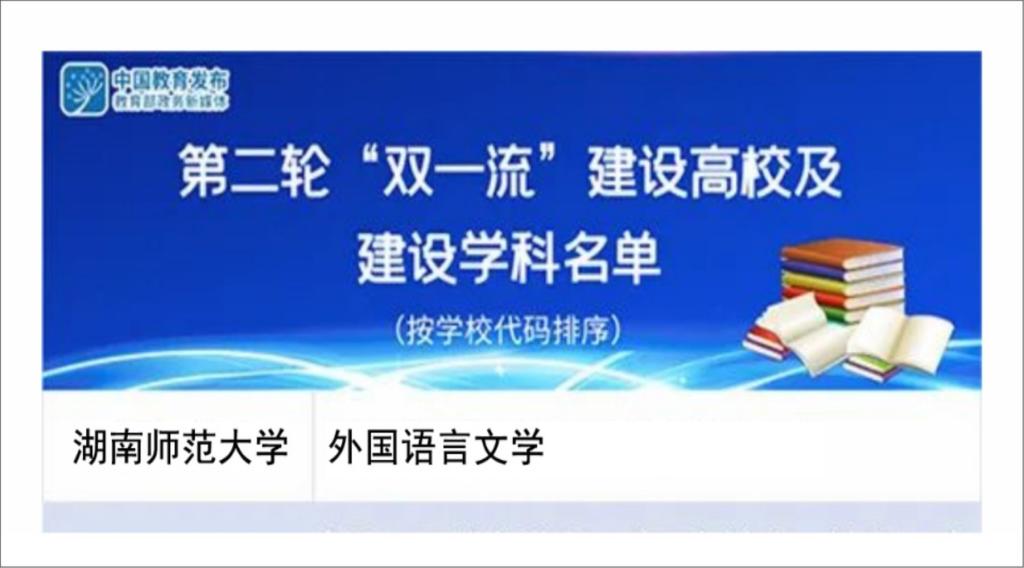 首轮建设期间,学科领衔国内外知名专家研制了《普通高等学校本科专业类教学质量国家标准(外国语言文学类)》等国家级标准,牵头制定了《普通高等学校本科外国语言文学类专业教学指南(上)——英语类专业教学指南》等一系列文件,为外语教育改革提供了中国方案;学科带头人蒋洪新教授入选欧洲科学院院士,获首届全国教材建设先进个人,受到习近平总书记等党和国家领导人的亲切接见;获教育部高校科研优秀成果奖(人文社科类)一等奖(系湖南省在该奖项上零的突破);英语、俄语、朝鲜语、法语等4个专业获批国家一流专业建设点,“‘一带一路’背景下跨文化障碍语言交际虚拟仿真实验”“英语文学导论”“英语演讲与辩论”等6门课程获评国家级一流课程,1门课程入选教育部首批课程思政示范课程;学科教师团队被确定为教育部首批“全国高校黄大年式教师团队”(全国外语类团队仅2个),外国语学院被人力资源和社会保障部、教育部授予“全国教育系统先进集体”荣誉称号,英语系被中华全国妇女联合会授予“全国三八红旗集体”荣誉称号。先后涌现出全国英语演讲大赛总冠军、全国大学生英语辩论赛一等奖、“挑战杯”大学生课外学术科技作品竞赛一等奖、全国师范生技能竞赛一等奖等一大批优秀典型,斩获各类奖项240余项。