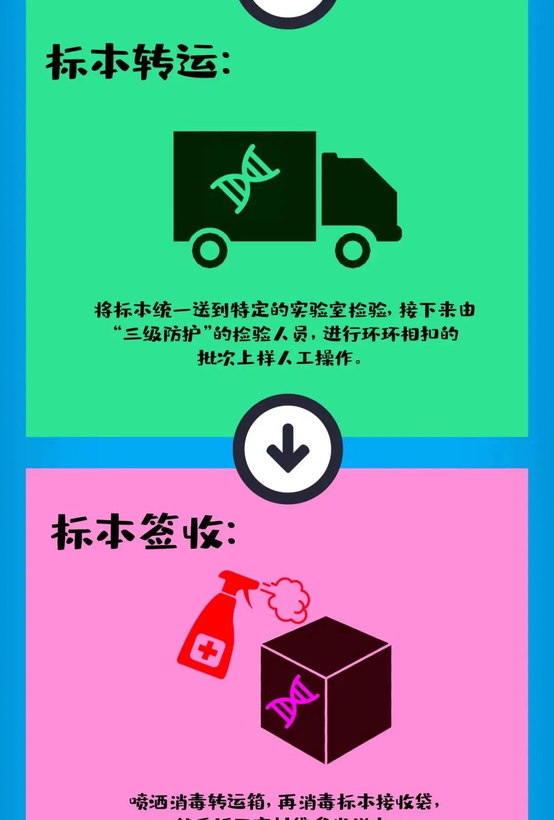 对于大家来说,核酸检测看似只有两步:登记采样,等待数小时后在健康码上查询结果。事实上,在这看似轻松的两步背后,还凝聚了基因扩增实验室(PCR实验室)检验人员的大量工作。一份核酸报告的诞生要经历采样、标本转运、标本签收、核酸提取、核酸转移、核酸扩增、结果审核……详见↓
