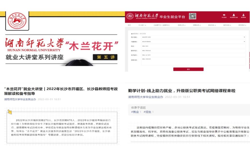 主动畅通交流渠道,确保“就业指导不断线”。全面启动“一对一”线上就业指导咨询服务,遴选了16名经验丰富的咨询师轮流线上值班,面向全校学生提供全天候的“一对一”个性化咨询服务。开展“木兰花开”就业大讲堂系列讲座,邀请行业专家重点围绕就业形势、教师招聘、面试技巧等方面进行指导。开设“勤学计划”网络课程、“荧光行动”线上课程,为毕业生提供公职类就业、生涯规划和就业指导等方面的课程资源,确保就业指导第二课堂“不掉线”。