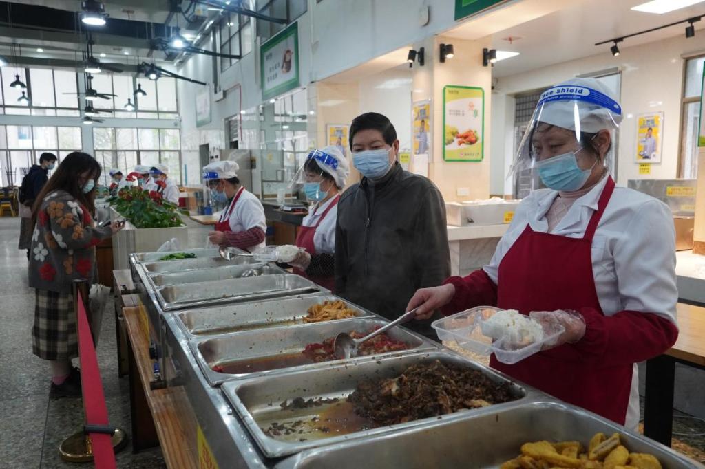 疫情当前,膳食先行。学校食堂根据防控工作要求,多方协调解决食材采购运送、师生伙食保障中出现的问题,及时调整了供餐模式,将现有自助餐形式改为分餐打包,为前来就餐的师生打包、装盒,避免集中就餐造成聚集性传染。