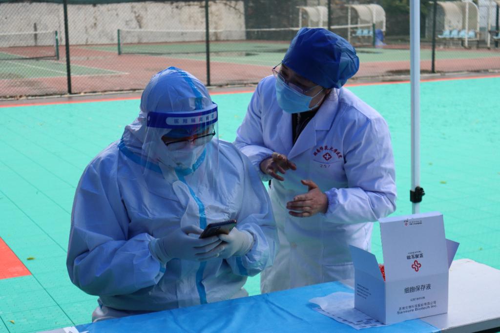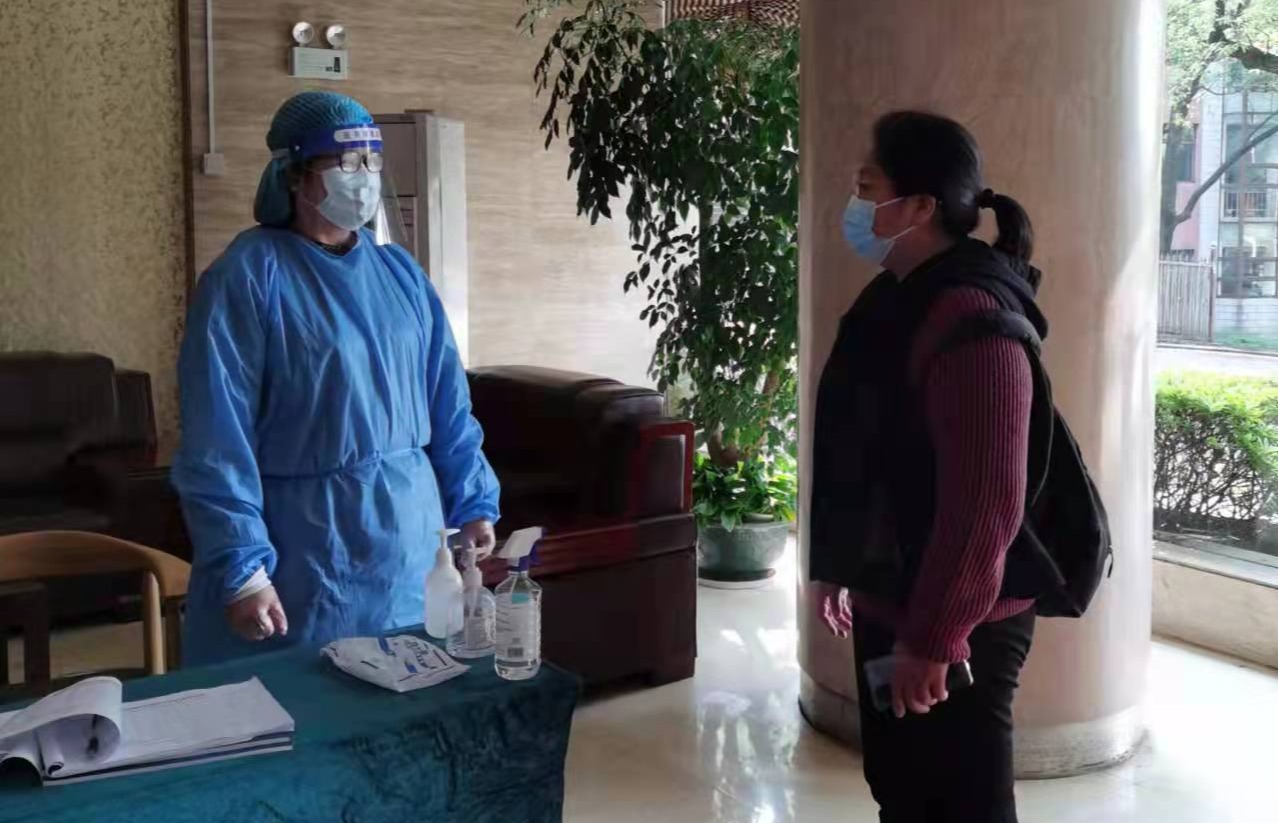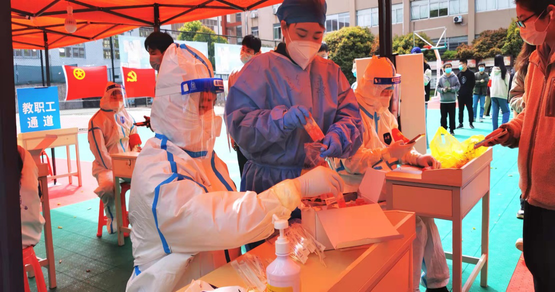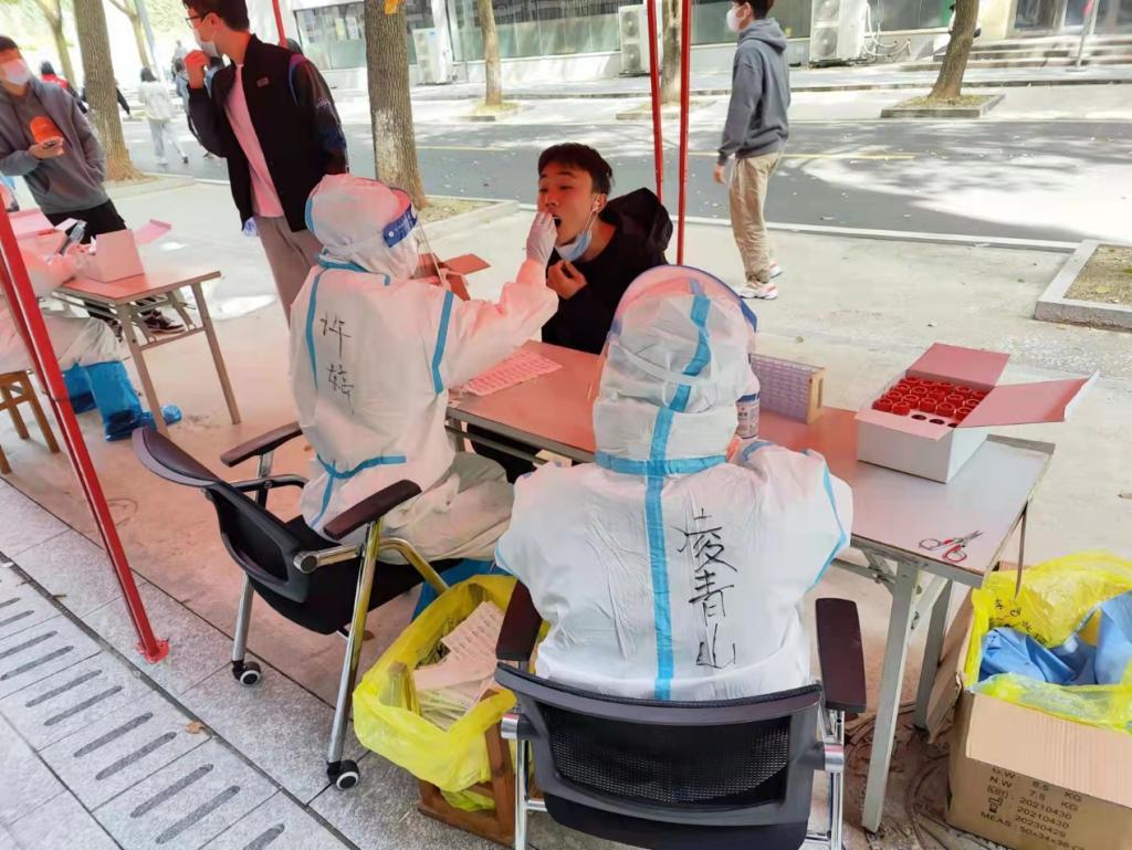 德智园宿舍区封控管理,90后年轻党员罗昊主动提出担任德智园宿舍区核酸检测工作负责人。他勇挑重担,冲锋在前。当得知德智园有不少黄码同学需要上门单独做核酸检测时,党员陈奕良同志主动请缨单独采集,每天穿着防护服上5楼,为同学们做核酸检测。罗昊和他的团队成员--党员凌青山、陈奕良、许婷等同志连续多日奋战在德智园,为近4000名学生做好核酸检测工作,并为每一位黄码学生认真做好上门服务工作;凌青山医生安置好瘫痪在床的父亲,主动留下担任驻园医生。60岁的老同志李辉光医生每天在核酸检测第一线坚持工作超过5个小时。