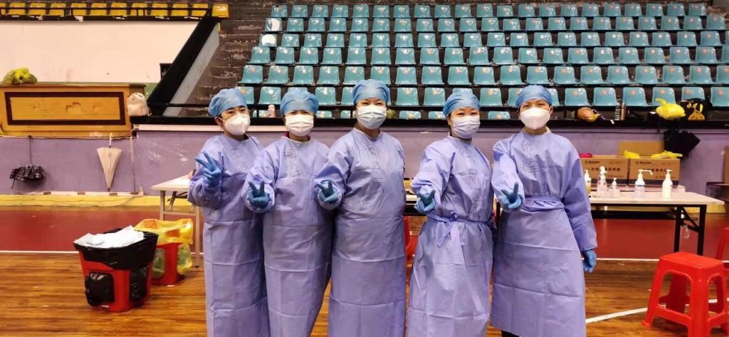 护士长张红伟负责田径场核酸检测工作,她带领的医护队伍担任医院预检分诊工作,为每位隔离师生准备了五个一——“一份盒饭、一瓶矿泉水、一盒纸巾、一包口罩、一瓶手消”。她的团队中,年轻的小护士李阳每天悉心指导志愿者老师穿脱防护服,党员何琳慧医生一人一组开展核酸检测。在倾盆大雨中,田径场的帐篷全部被吹倒,为防止大雨淋湿防疫物资,陈亚娟马上用自家车及时把物资转运到风雨长廊。
