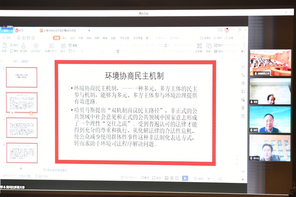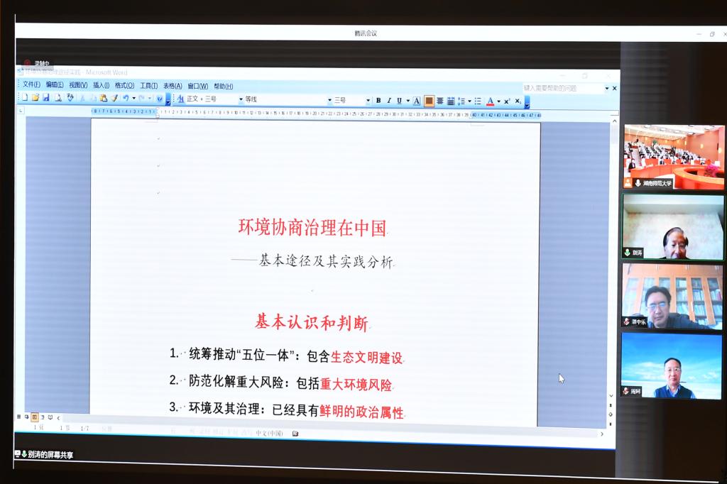 随后,7位专家分别进行主题报告。生态环境部法规与标准司别涛司长的《环境协商治理在中国——基本途径及其实证分析》,中国法学会环境资源法学研究会副会长、中国人民大学法学院、湖南大学法学院周珂教授的《环境协商治理的整体性思维》,中国法学会行政法学研究会副会长、中国法学立法学研究会副会长、北京大学法学院湛中乐教授的《生态环境治理中的协商与合作》,我校生态文明研究院院长刘湘溶教授的《安博线上平台环境协商治理的“一点体会 三点看法”》,湖南省政协研究室唐宇文主任的《环境协商治理的湖南实践》,中南林业科技大学校长、湖南专业特色智库——湖南绿色发展研究院院长廖小平教授的《环境协商治理的三个理论问题》,湖南省委宣传部社科规划办陈湘文主任的《积极发挥智库在环境协商治理中的重要作用》等报告依次围绕“全过程民主视域下的环境协商治理”的核心与理论前沿问题进行了分享与探讨。