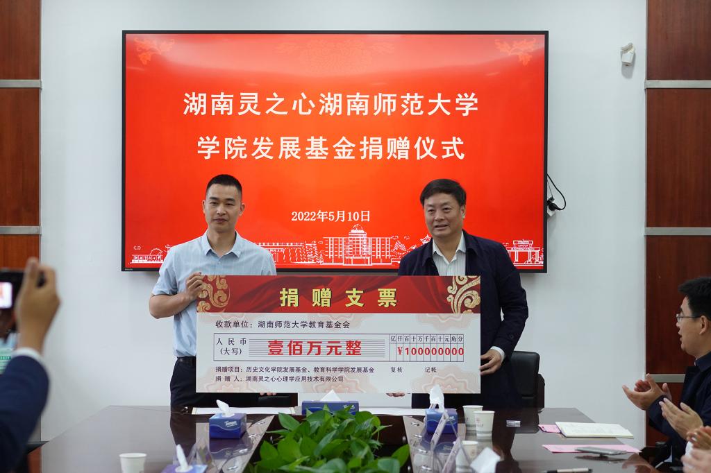 (供稿 教育基金会)5月10日上午,我校学院发展基金捐赠仪式在校办公楼二会议室举行。湖南灵之心公司捐赠人民币壹佰万元整,用于历史文化学院、教育科学学院建设发展。湖南灵之心心理学应用技术有限公司董事长周淋燕、副总经理丁亚运,我校副校长王辉出席仪式。校友总会、教育基金会秘书长梁勇主持仪式。
