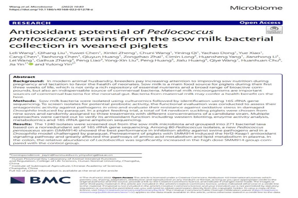 (供稿 生命科学学院)我校生命科学学院印遇龙院士团队尹佳博士课题组于Microbiome (影响因子:14.65,中科院一区Top)上发表了一篇题为“Antioxidant Potential ofPediococcus PentosaceusStrains From the Sow Milk Bacterial Collection in Weaned Piglets”的研究论文。这项研究探讨了母猪乳汁微生物群多样性,为开发缓解断奶仔猪应激的新型绿色饲料添加剂提供了重要资料和新的思路。