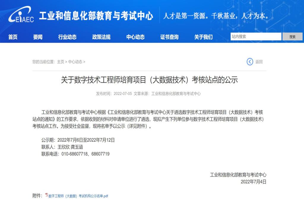 (通讯员 鲍静旗)近日,工业和信息化部教育与考试中心公布数字技术工程师培育项目(大数据技术)考核站点名单,我校成为首批数字技术工程师培育项目(大数据技术)考核站点之一。