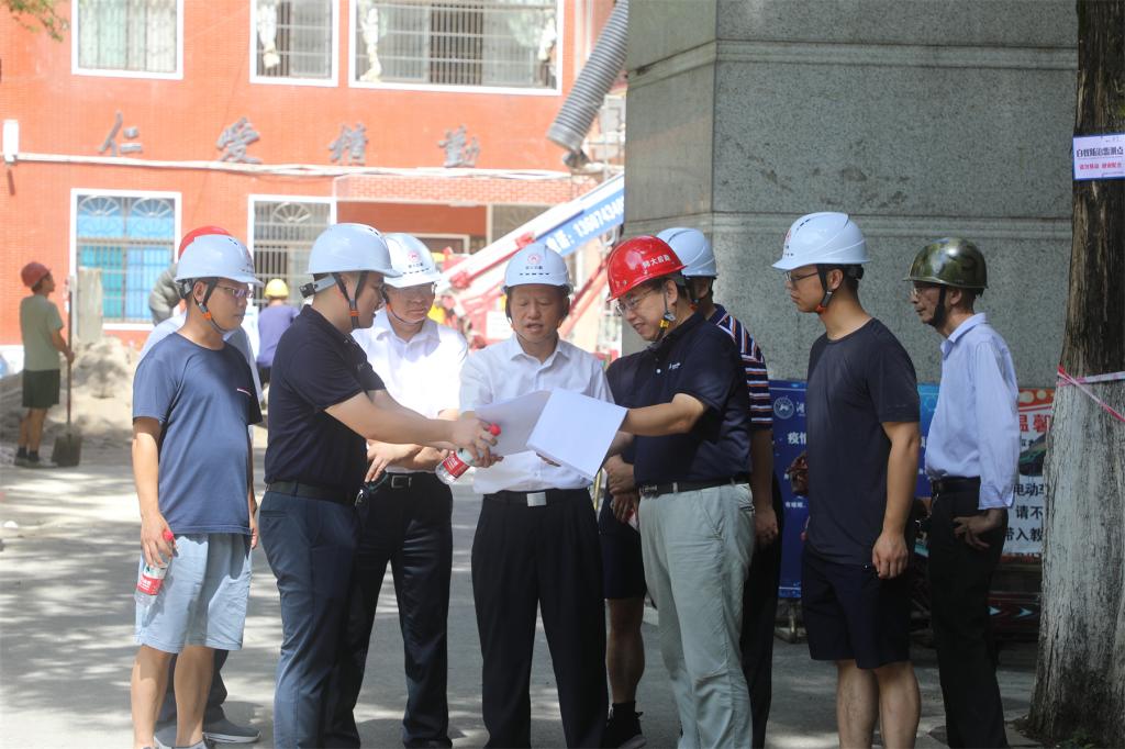 蒋洪新实地察看了基建中心和各项工程现场,对不惧酷暑,辛苦劳作的工作人员表示慰问和感谢,他听取学校基建处、后勤管理处(后勤集团)、施工单位负责人的汇报,了解施工改造细节与工程进度,对基建施工现阶段取得的成果表示肯定。他指出,在建工程对进一步改善我校育人环境,提升师生幸福感、获得感具有重要意义。他要求,要科学合理安排工期,提高施工效率,按时按质完工;要加强施工安全管理,严格遵循施工现场规范要求;要及时提出、通报和解决施工过程中遇到的各项问题,确保工程顺利进行;要做好基础设施设备配套附属设施养护维修工作,加强日常管理,规律性地对建筑物进行处理加固维修。