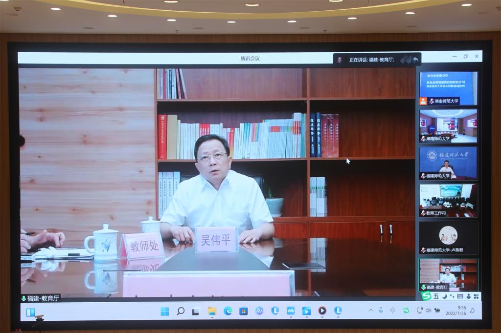 王玉清指出,湖南省教育厅坚决落实计划实施各项工作要求,全力服务保障、全程跟踪对接、全面督促指导,共同开启师范教育工作的新局面;吴伟平强调,福建省教育厅将集合全省教育资源支持福建两所高校做好帮扶工作,构建协同提质共同体;宁夏回族自治区教育厅教师工作处处长马建林表示,宁夏回族自治区教育厅将主动加强沟通协调,抢抓机遇,创造条件,支持项目的实施,推动宁夏师范学院高质量发展。
