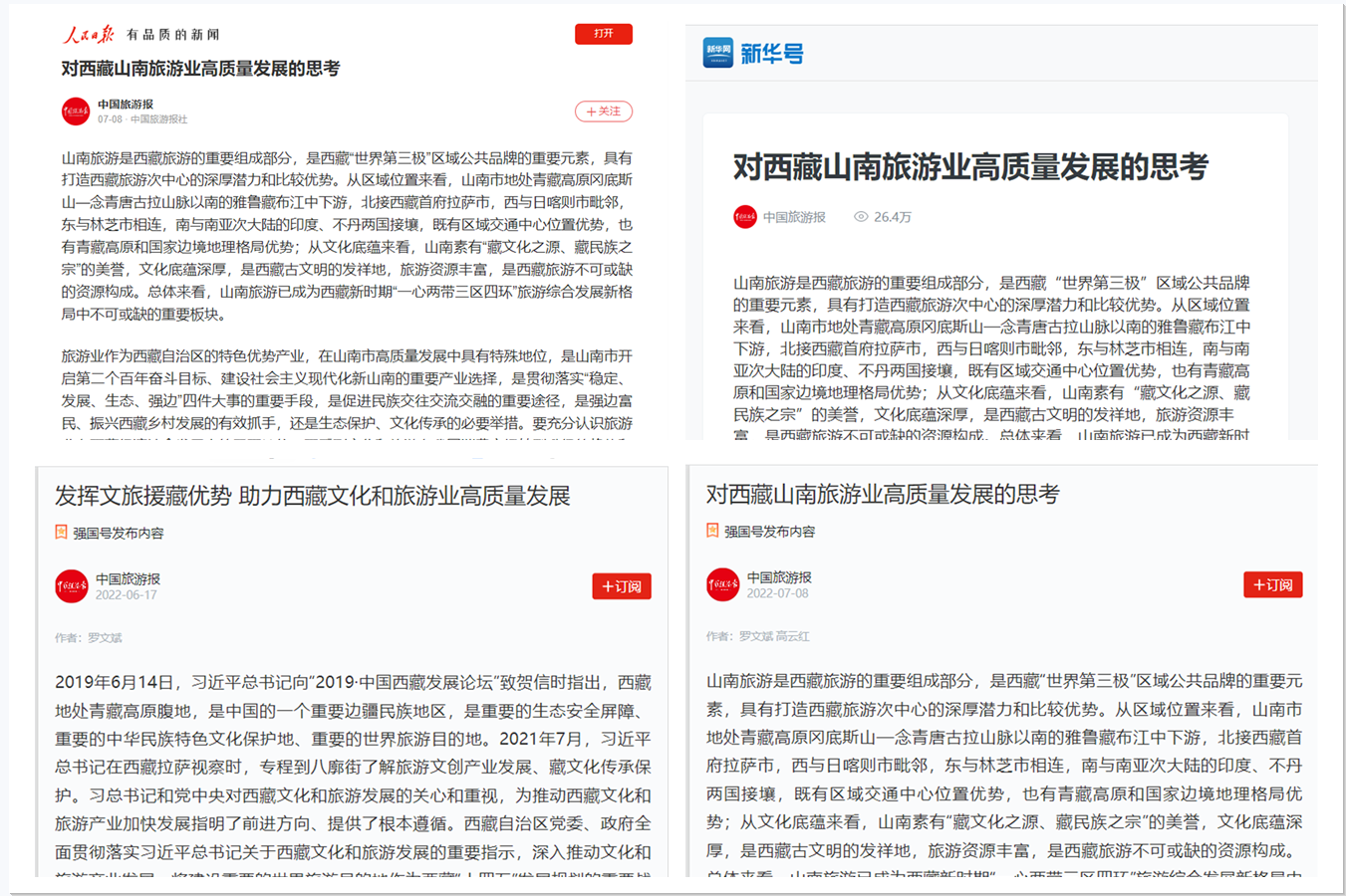 (供稿 党委组织部)近日,湖南省第九批援藏干部、我校旅游学院副教授罗文斌撰写的《对西藏山南旅游业高质量发展的思考》《发挥文旅援藏优势,助力西藏文化和旅游产业高质量发展》等系列文旅援藏理论成果被《学习强国》《人民日报》《新华网》等媒体相继转载,引发广泛关注和良好反响。
