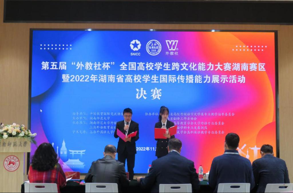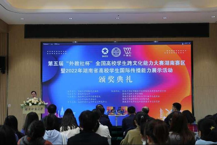 (通讯员 李澧)11月26日,第五届“外教社杯”全国高校学生跨文化能力大赛湖南赛区暨2022年湖南省高校学生国际传播能力展示活动决赛以及颁奖典礼在我校外国语学院腾龙楼613举行。本次大赛采用线上线下结合的方式举办。上海外语教育出版社副总编辑谢宇、我校副校长刘子兰出席颁奖典礼并致辞。颁奖典礼由外国语学院副院长刘白教授主持。