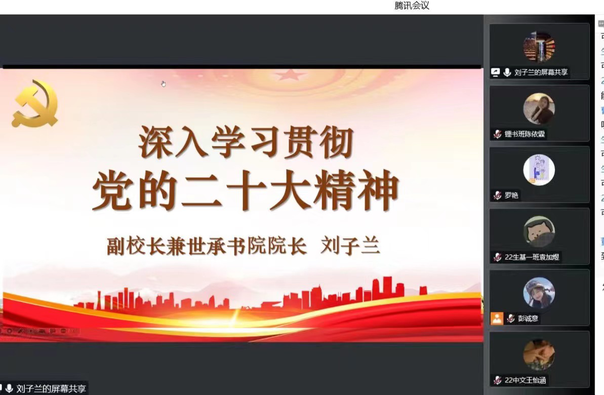 (通讯员 潘看)12月1日下午,世承书院在线上举行了主题为“深入学习贯彻党的二十大精神”的宣讲会。此次宣讲会由副校长兼世承书院院长刘子兰教授主讲。世承书院副院长兼直属党支部副书记罗艳主持会议。