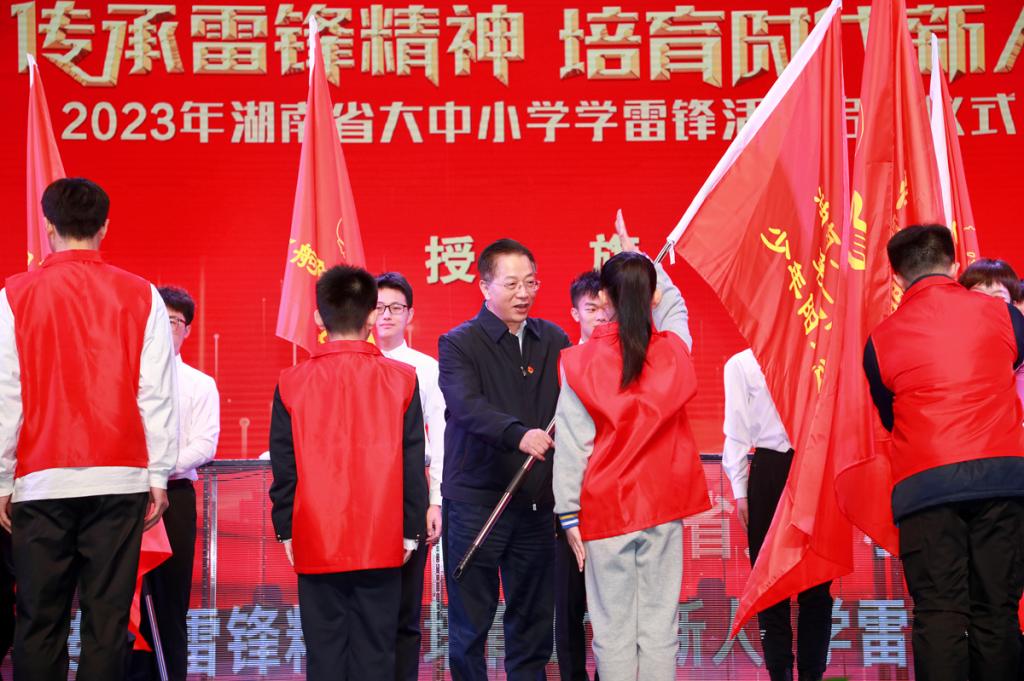 仪式上,夏智伦、罗桂香等为我校外国语学院“语你同行”志愿服务队等全省8支学雷锋志愿服务队授旗。