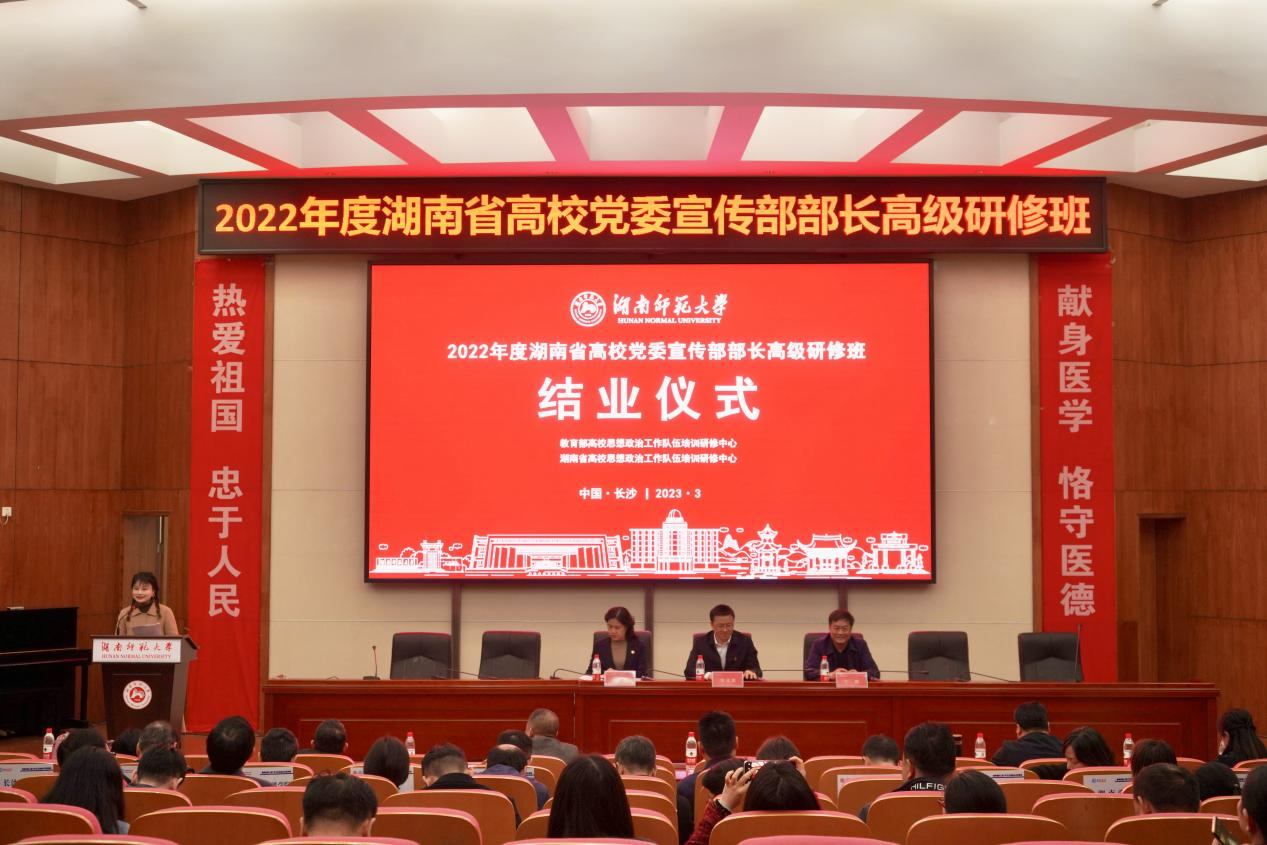 我校党委委员、宣传部部长段巍宣读了《安博线上平台准予王建湘等113名湖南省高校党委宣传部部长高级研修班学员结业的决定》和《安博线上平台授予张佳等13名学员“2022年度湖南省高校党委宣传部部长高级研修班优秀学员”荣誉称号的决定》。