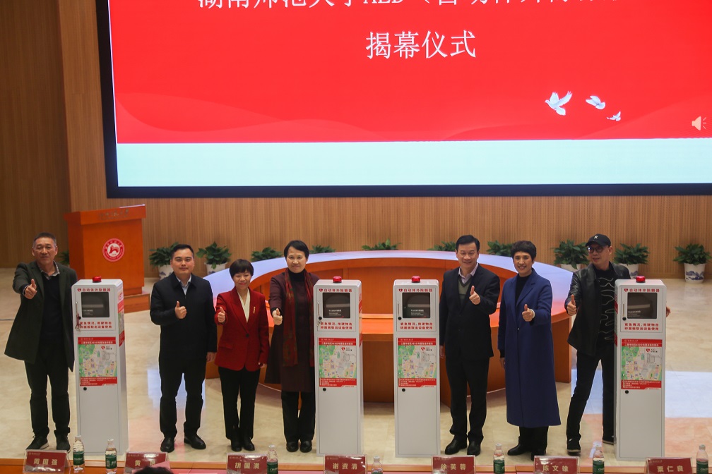 谢资清、胡国潢、徐芙蓉、后勤管理处党委书记陈文雄、保卫处副处长粟仁良、长沙市第四医院(附属长沙医院)急诊急救中心主任黄艳共同为AED投放启动仪式揭幕。
