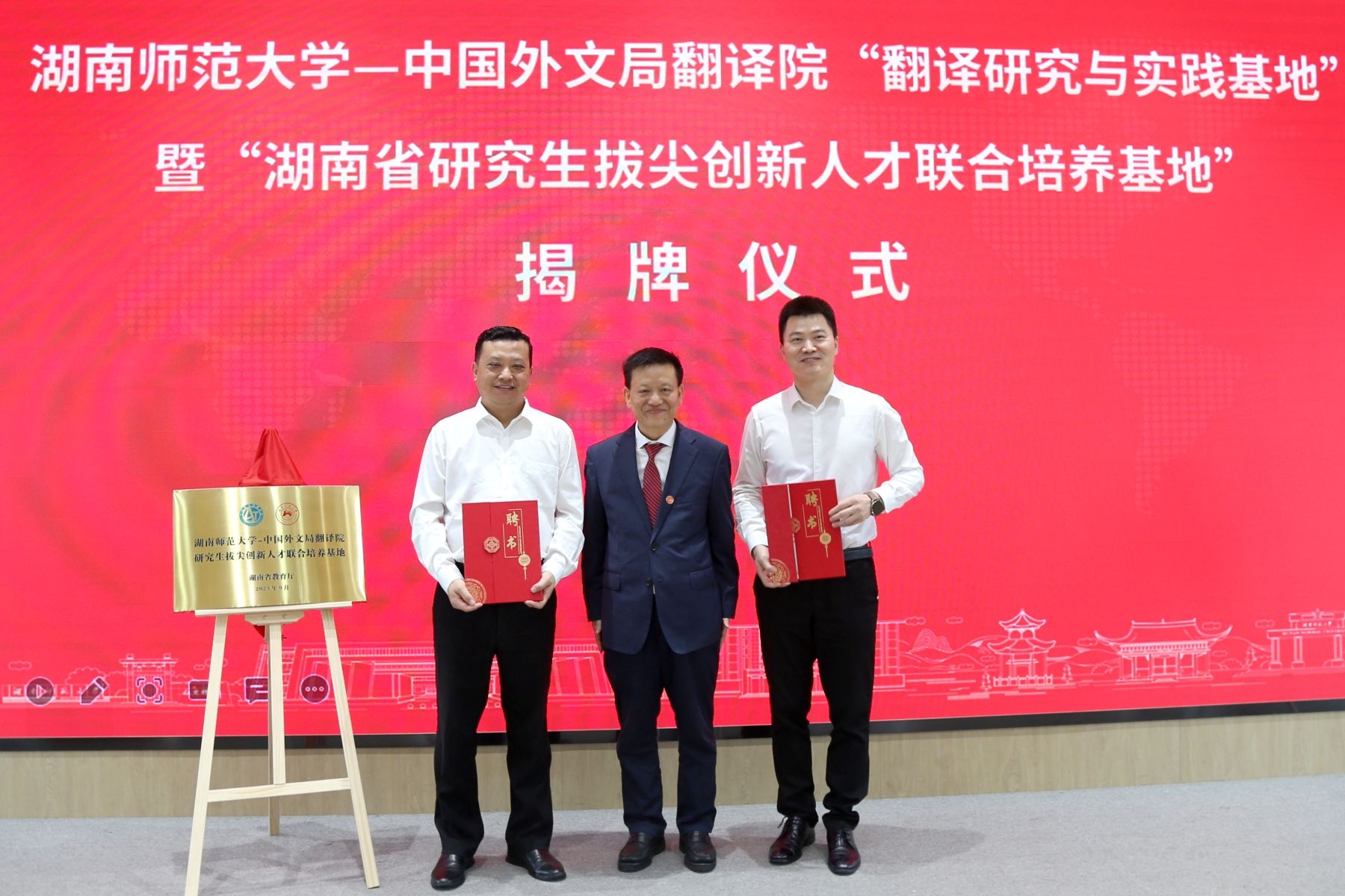 随后,中国外文局翻译院院长黄玉龙、副院长邢玉堂,蒋洪新、我校外国语学院院长曾艳钰共同为“翻译研究与实践基地”和“湖南省研究生拔尖创新人才联合培养基地”揭牌。