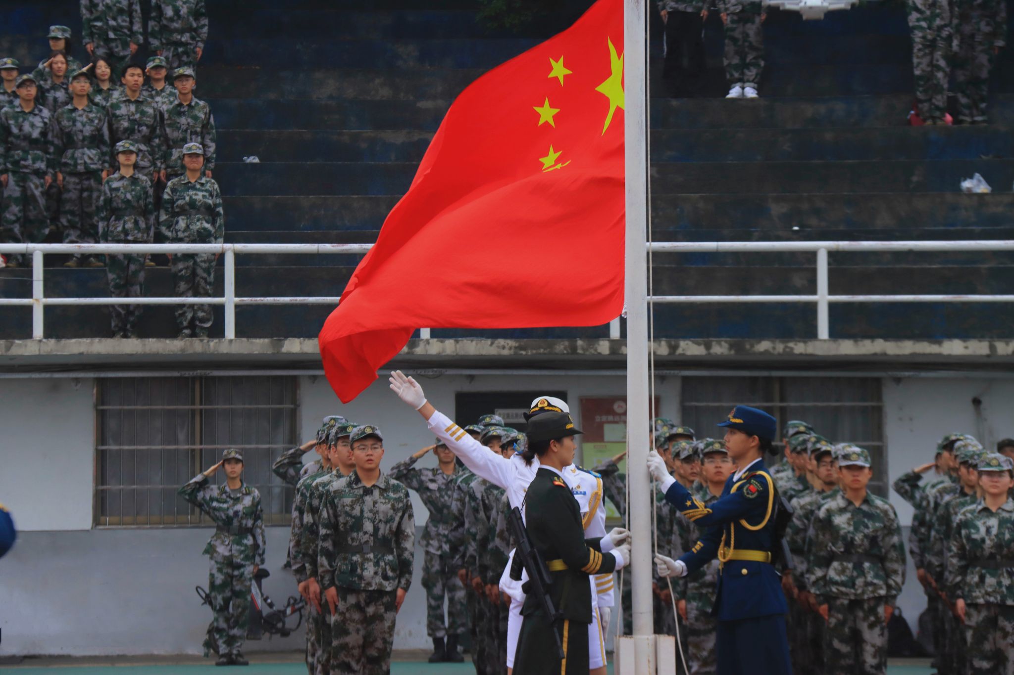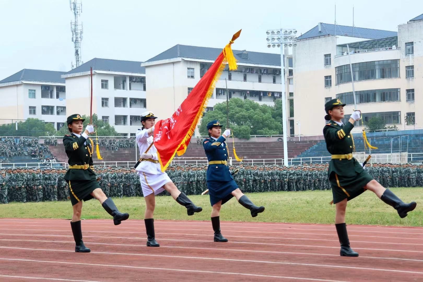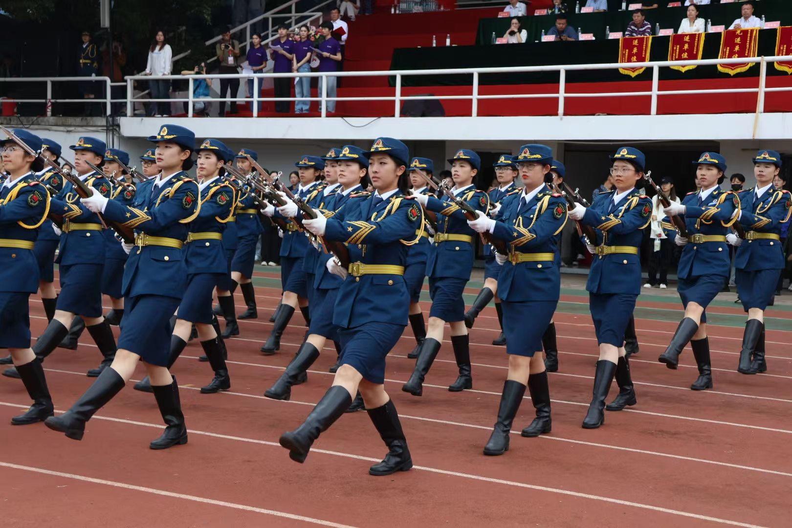 军训成果汇报仪式由女子国旗护卫队大队长、体育学院曾荟珍同学指挥,随着分列式进行曲响起,标兵就位,在引导员的引领之下,各学院方阵迈着坚定的步伐,喊着嘹亮的口号,依次踏正步走过主席台前接受检阅。