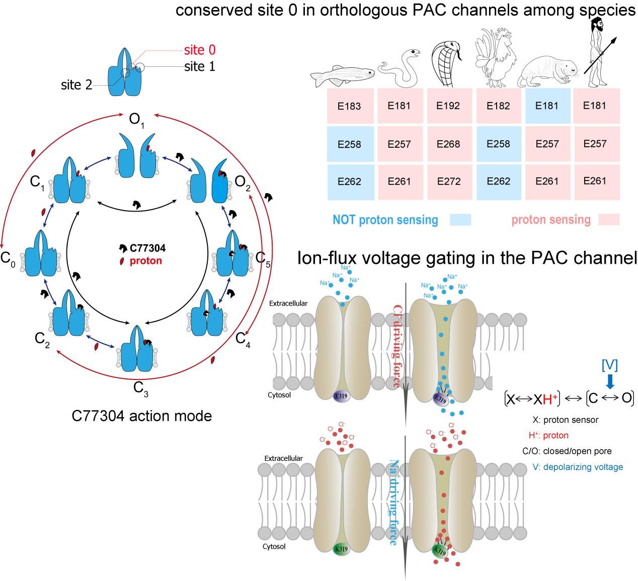 质子激活氯通道PAC是2019年鉴定到的新型氯离子通道,与缺血导致的神经细胞死亡密切相关,是潜在的脑缺血治疗靶点。研究团队首次发现了PAC通道的双功能小分子调制剂C77304,阐明了C77304双向调控PAC通道的分子机制,并以其作为分子探针揭示了PAC通道的质子感受分子机制,发现该机制在来源于不同物种的直系同源PAC通道中具有保守性。同时,本研究发现PAC通道除经典的质子门控外还存在非经典的离子流电压门控,进而构建了PAC通道的多模态门控模型,即跨膜电压和质子既可分开又能协同驱动PAC通道开放。