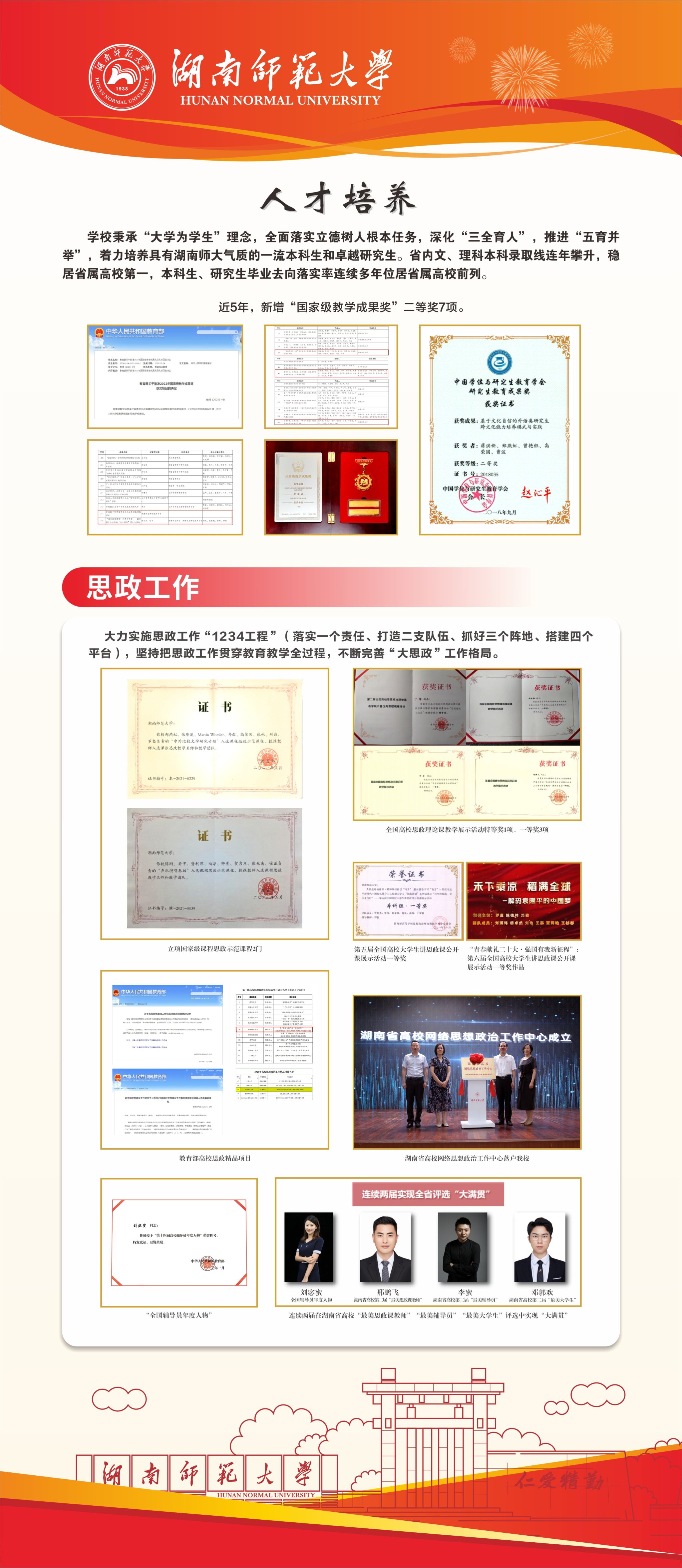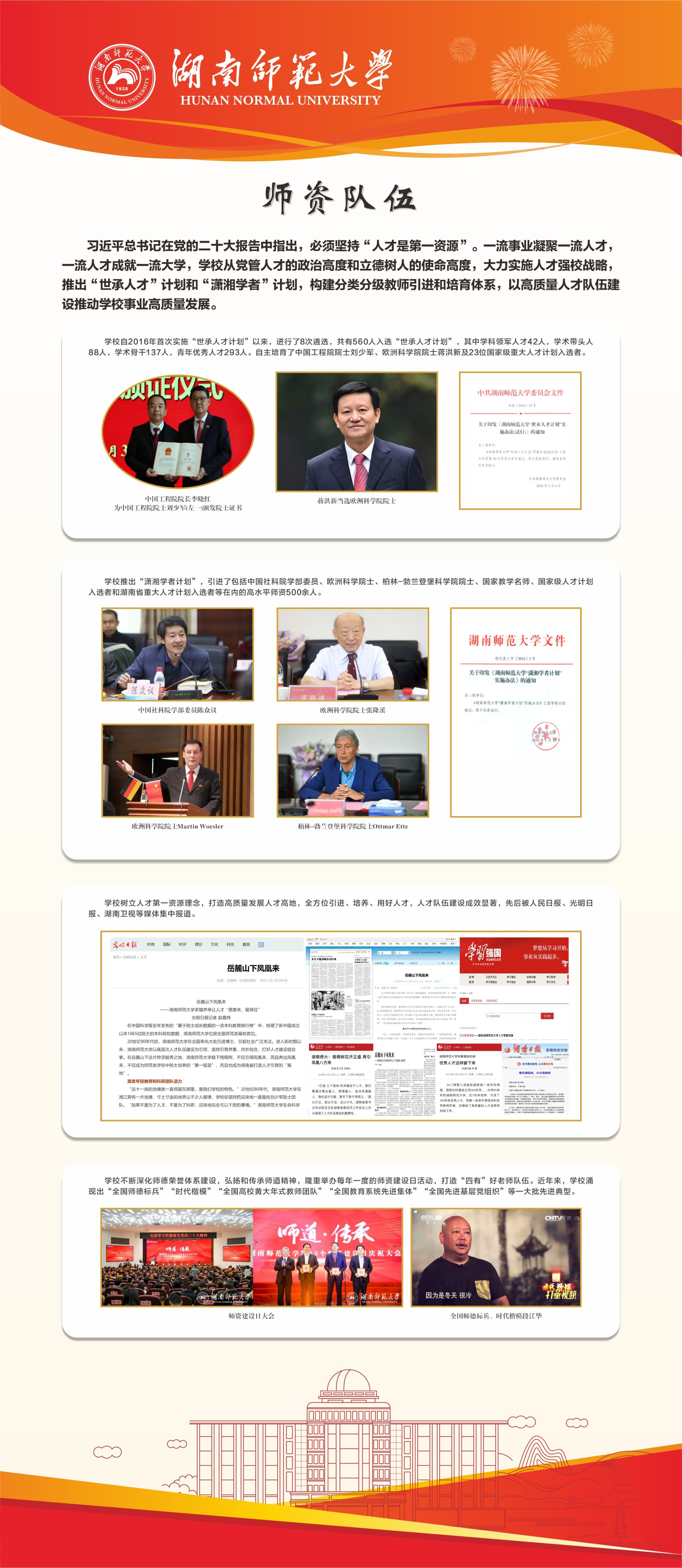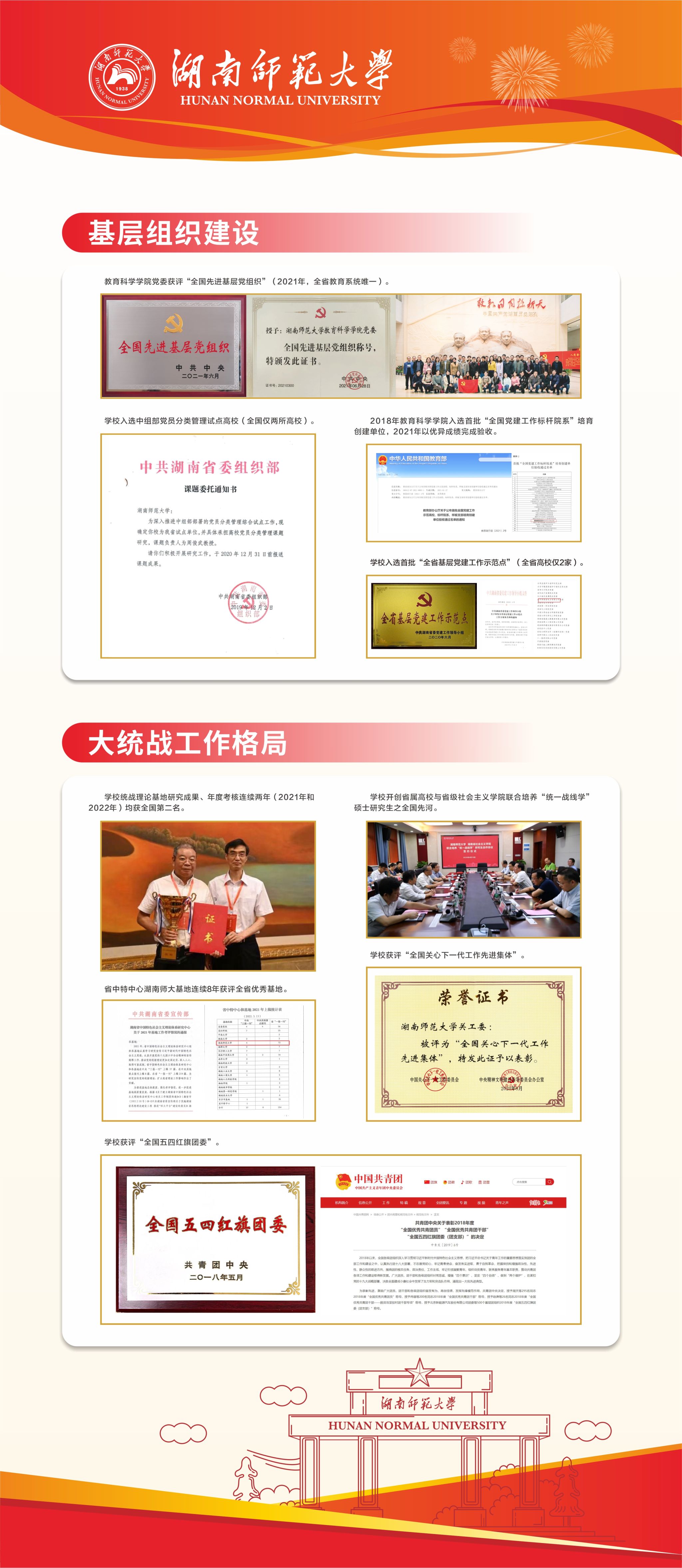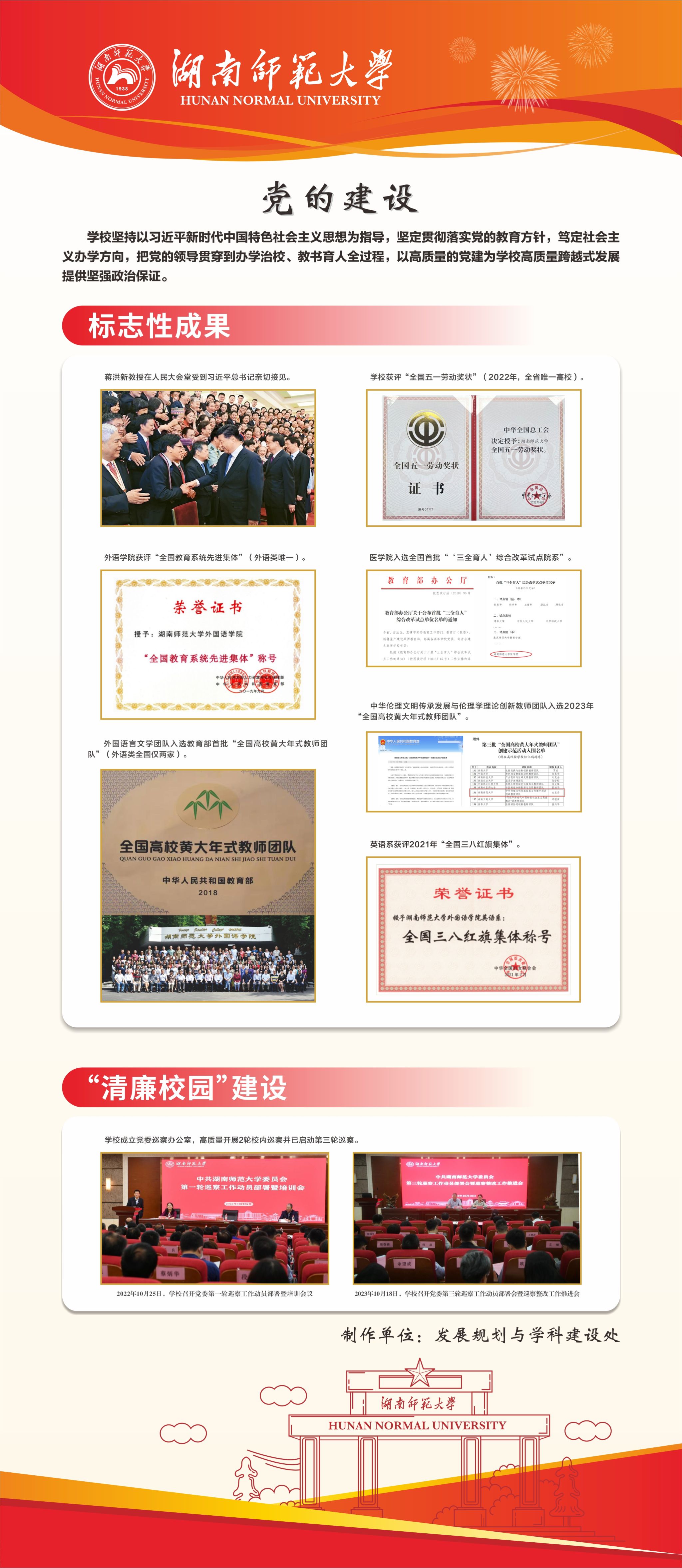 近年来,学校紧扣“中国特色、世界一流”,扎根中国大地、湖湘大地稳扎稳打,坚定落实立德树人根本任务,着力培养一流人才、产出一流成果、提供一流服务,迸发出强劲发展动能。党建工作达到新高度,学科发展获得新突破,育人质量迈入新层次,人才梯队实现新跨越,科学研究跨上新台阶,社会服务展开新气象,对外开放呈现新格局,文化建设形成新品质,环境建设达到新水平,学校综合实力与核心竞争力明显增强,社会声望和影响力显著提升,迈入到进步最快、发展最好的新的历史阶段。