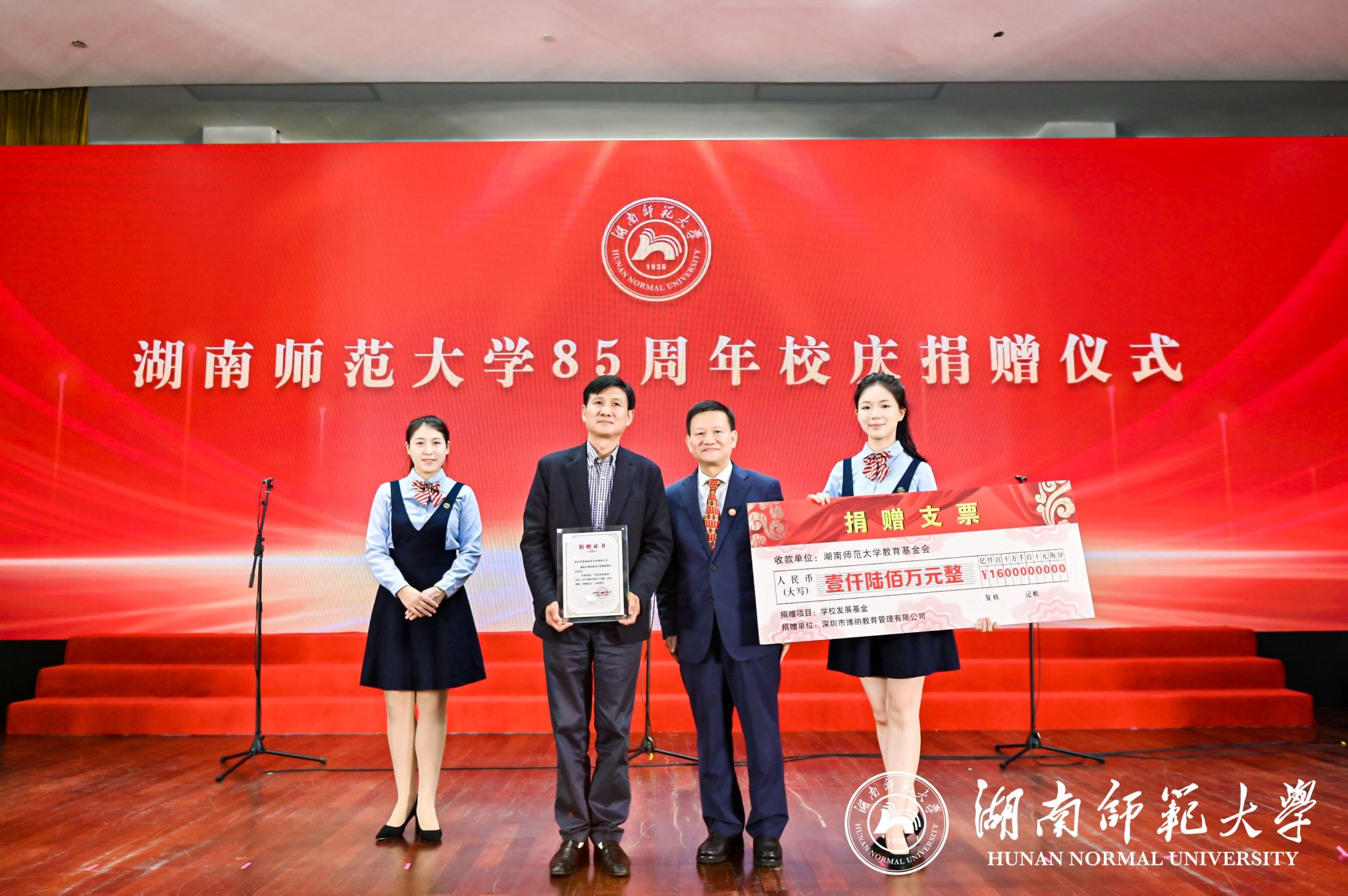 蒋洪新对深圳市博纳教育管理有限公司、山东奥德城投开发有限公司以及衡阳市中心医院的爱心义举表示衷心的感谢,并向捐赠方颁发捐赠证书。他说,近年来,学校积极推进校企校地合作,各项事业成效显著,办学水平大幅提升。在我校85周年校庆之际,深圳博纳、山东奥德以及衡阳市中心医院携手,支持我校建设发展,充分体现了对教育事业的高度重视和远见卓识。学校将努力打造校企医教融合、资源优势共享的协作平台,促进协同发展,实现多方共赢。