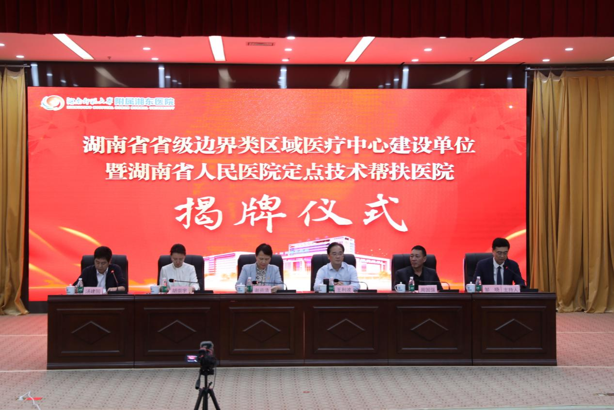 (供稿 附属湘东医院)11月2日,湖南省省级边界类区域医疗中心建设单位暨湖南省人民医院定点技术帮扶医院揭牌仪式在我校附属湘东医院举行。醴陵市委书记、经开区党工委第一书记王利波、我校副校长谢资清等出席。我校附属湘东医院党委副书记、院长邹晓主持揭牌仪式。
