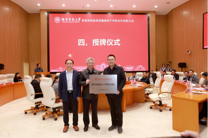 唐贤清为首批20家融媒体中心授牌,新闻与传播学院副院长王海刚与湖南省首批20家融媒体中心代表签订产学研合作协议。
