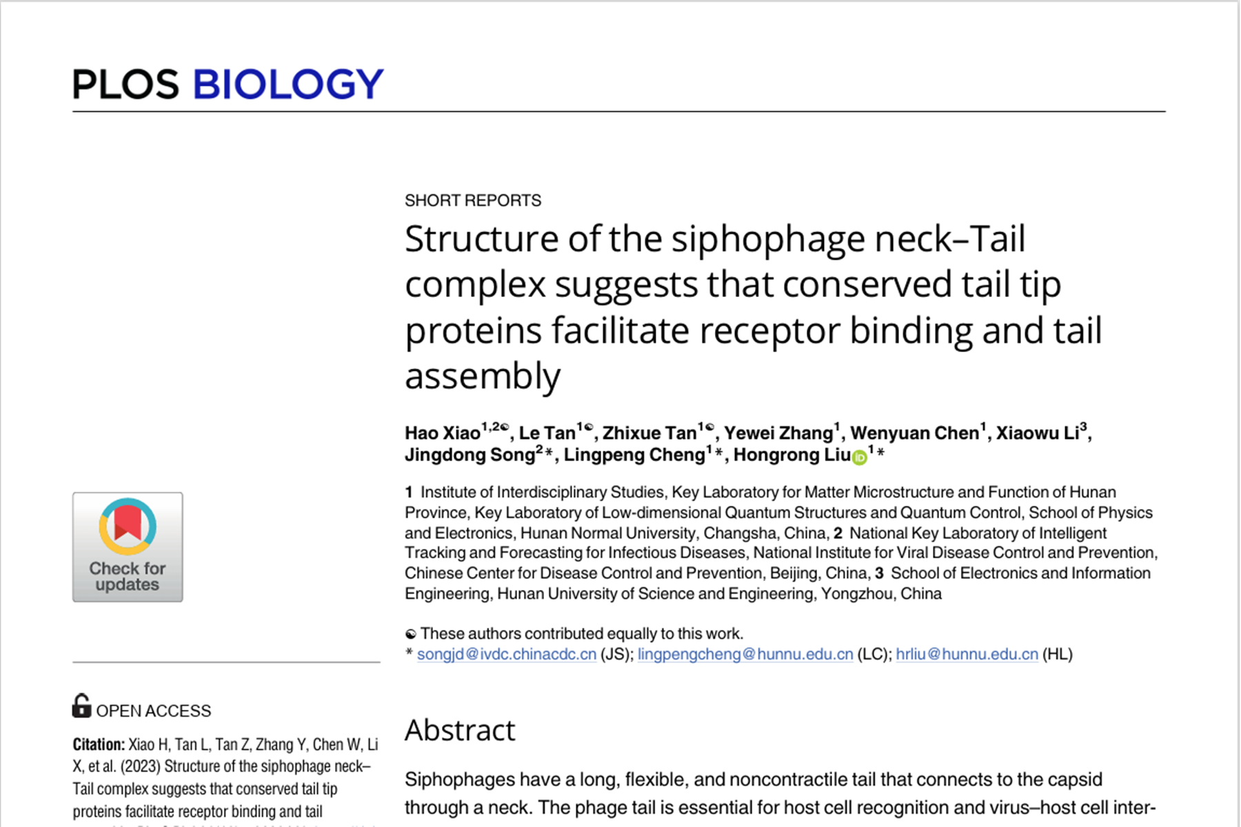 (通讯员 艾建平)近日,我校物理与电子科学学院和交叉科学研究院刘红荣、程凌鹏团队与中国疾控中心病毒病所宋敬东团队在长尾噬菌体结构研究领域取得突破,研究论文“Structure of the siphophage neck-tail complex suggests that conserved tail tip proteins facilitate receptor binding and tail assembly”在校定TOP期刊PLOS Biology(自科I类A级刊物)上发表。