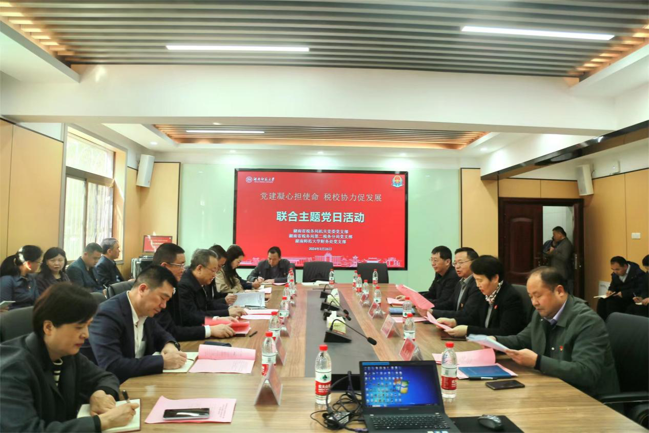 (供稿 财务处)3月26日,为认真学习贯彻两会精神,深入推进安博线上平台与湖南省税务局合作共建,助力科技创新,财务处党支部联合湖南省税务局机关党委、湖南省税务局第二税务分局党支部共同开展主题党日活动。副校长刘怀德出席活动并讲话,副校长谢资清作全国两会精神宣讲。