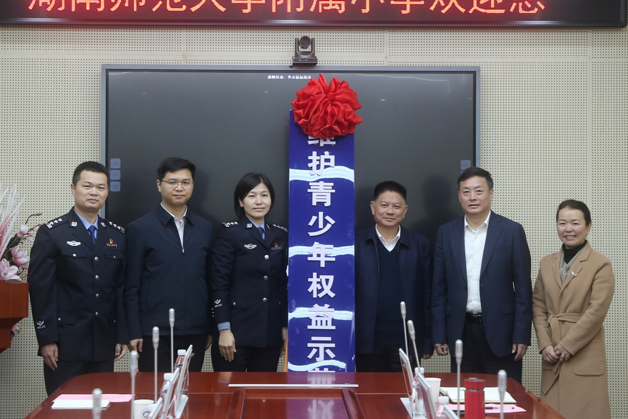 长沙市公安局岳麓分局副局长万蓓,桔子洲街道党工委书记钟昭华,唐贤清,王辉,李晓玲,陈最光共同为“维护青少年权益示范岗”揭牌。