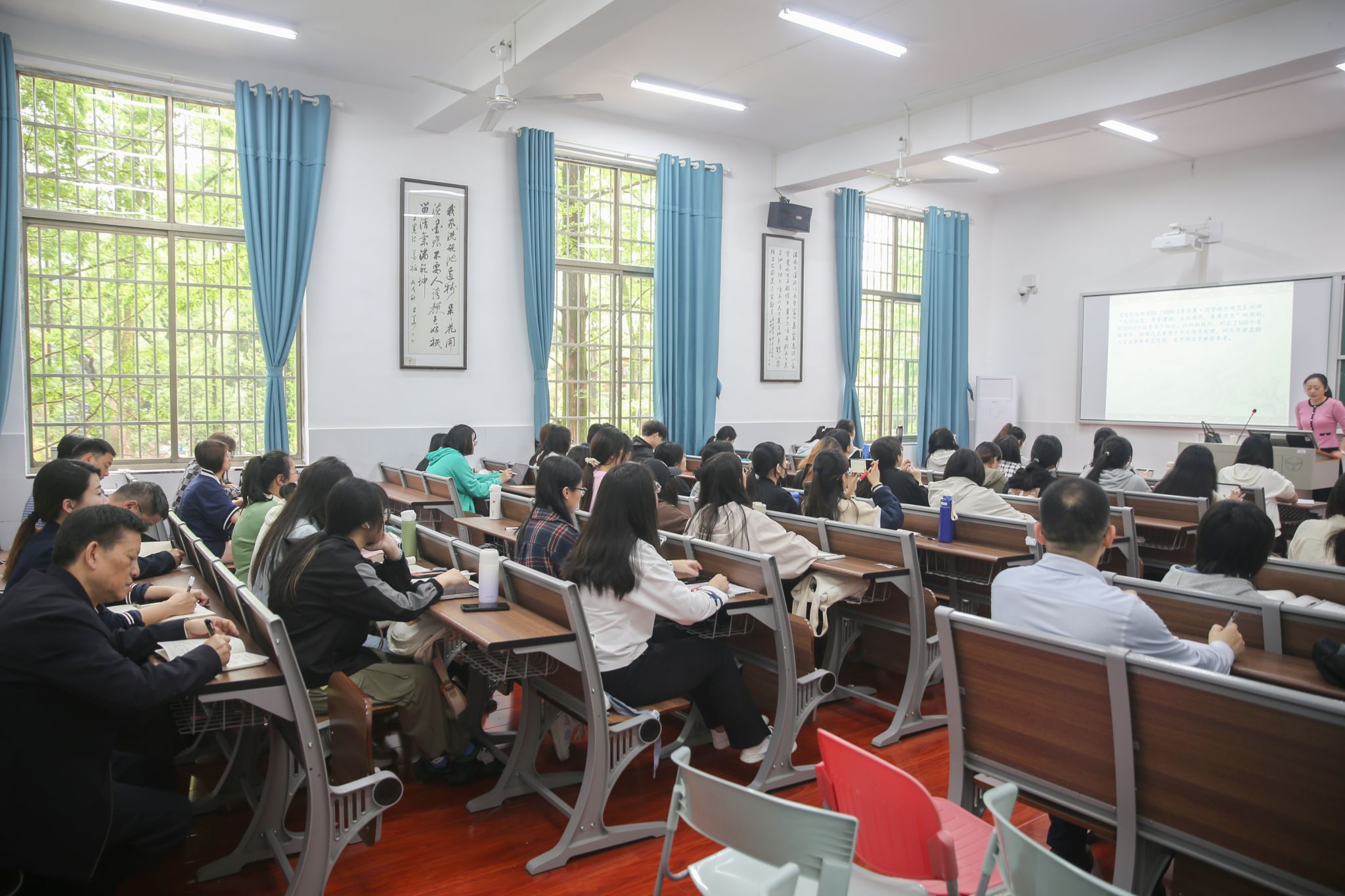 蒋洪新深入本科生课堂,分别听取文学院副教授唐智芳讲授的课程《汉字解析与教学》和历史文化学院副教授彭丽华讲授的课程《隋唐史》,对她们的精心备课、课堂讲授、教学组织表示肯定。课后,与老师们就教学形式、教学内容等方面进行了交流,勉励他们继续做好新时代教书育人工作。
