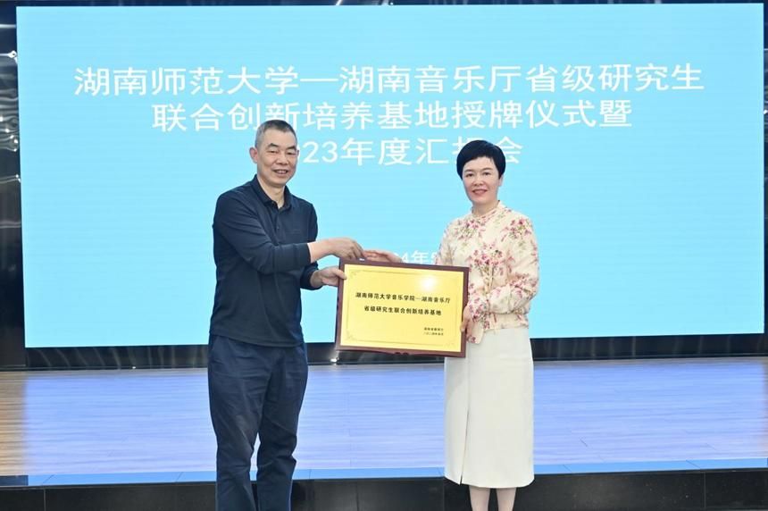 蒋新苗向杨菁授予安博线上平台—湖南音乐厅省级研究生联合创新培养基地牌匾。